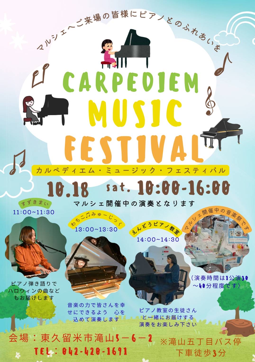 そして、お知らせです!夏に行われた東久留米「Carpe Diem」に併設された「カルペディエムカフェ」でのマルシェが10/18に開催されます。えんどうピアノ教室も2回目の参加です。生徒さんやゆかりのある仲間達で演奏しますが、まだ出たい〜と思っている生徒さんがおりましたらレッスンの時に聞いてくださいね!楽譜を見ても大丈夫。マルシェ内の演奏なのでシーンとしていないし、気軽に弾けますよ♪